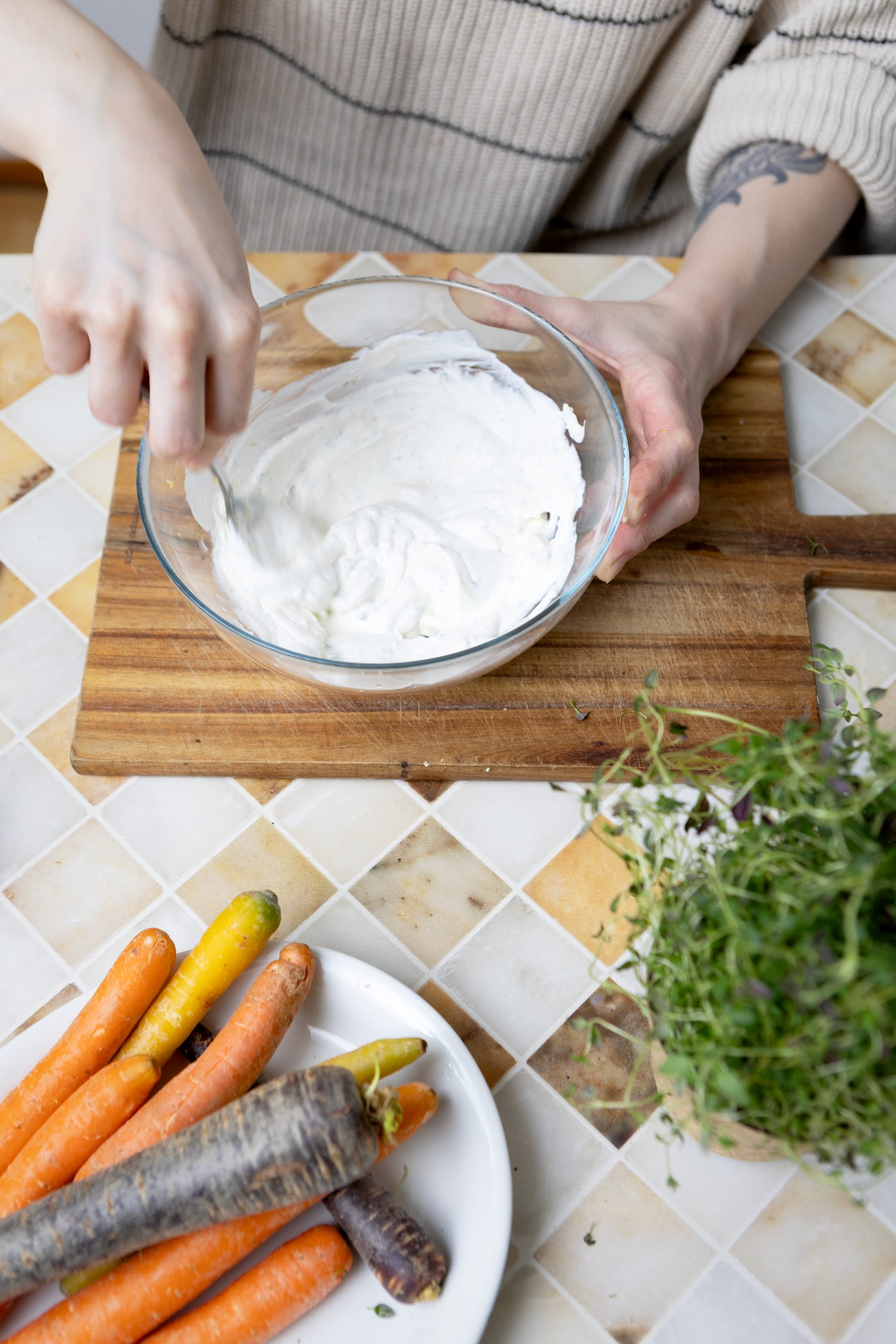Täytä kolot ricottatäytteellä (pursotinpussi on tähän kätevä). Leikkaa porkkanat sopiviksi paloiksi ja asettele tartalettien päälle. Koristele halutessasi timjamilla.