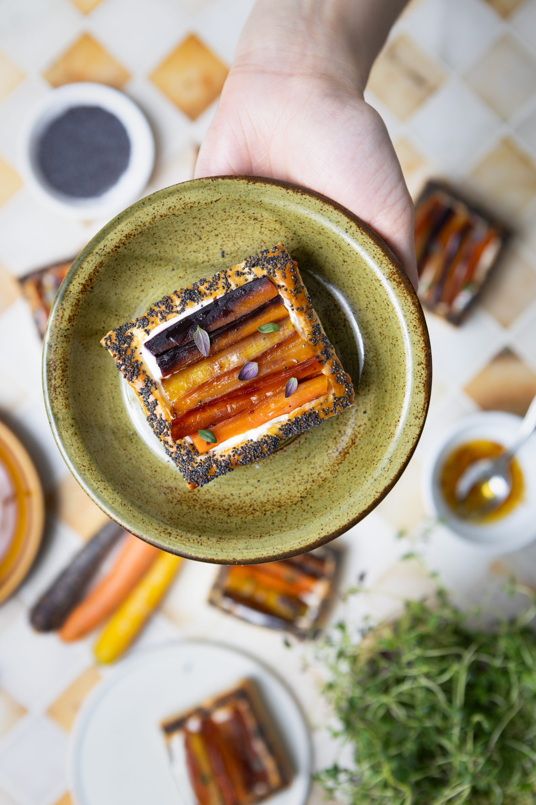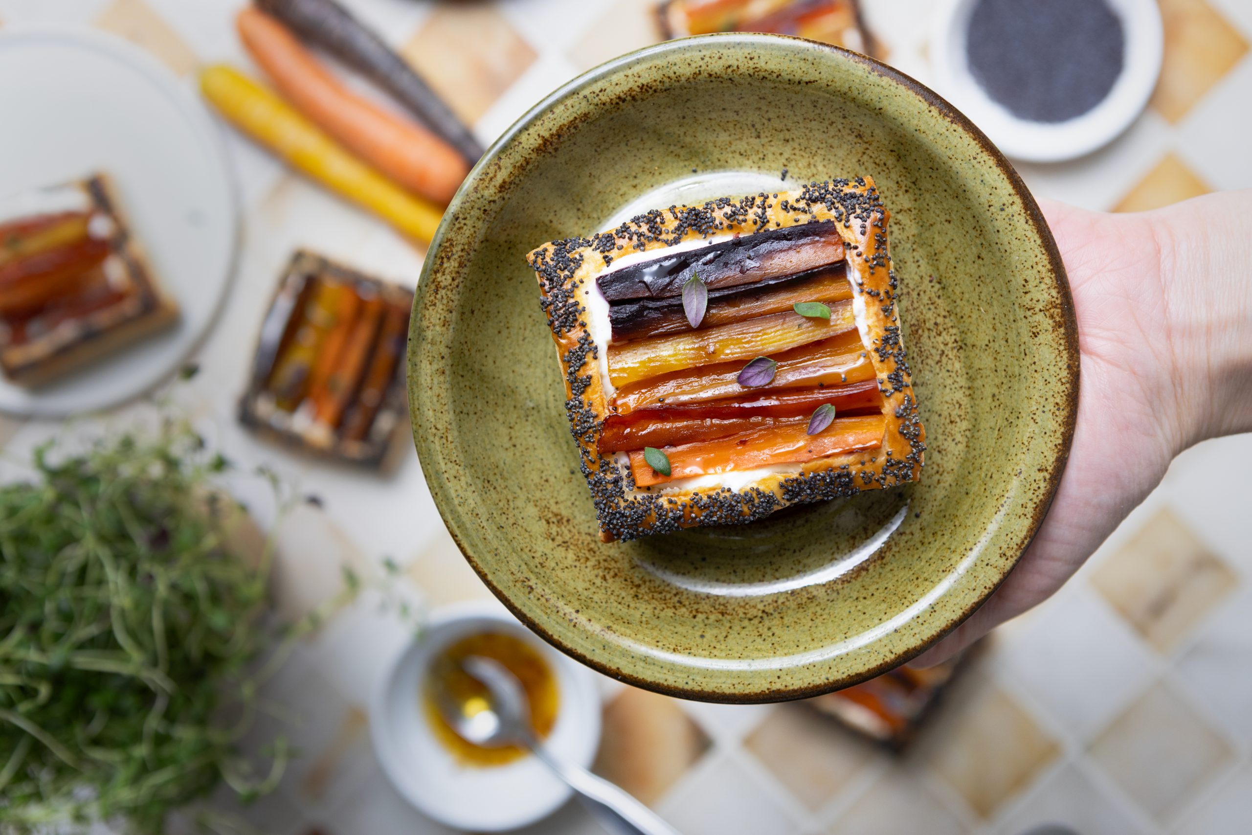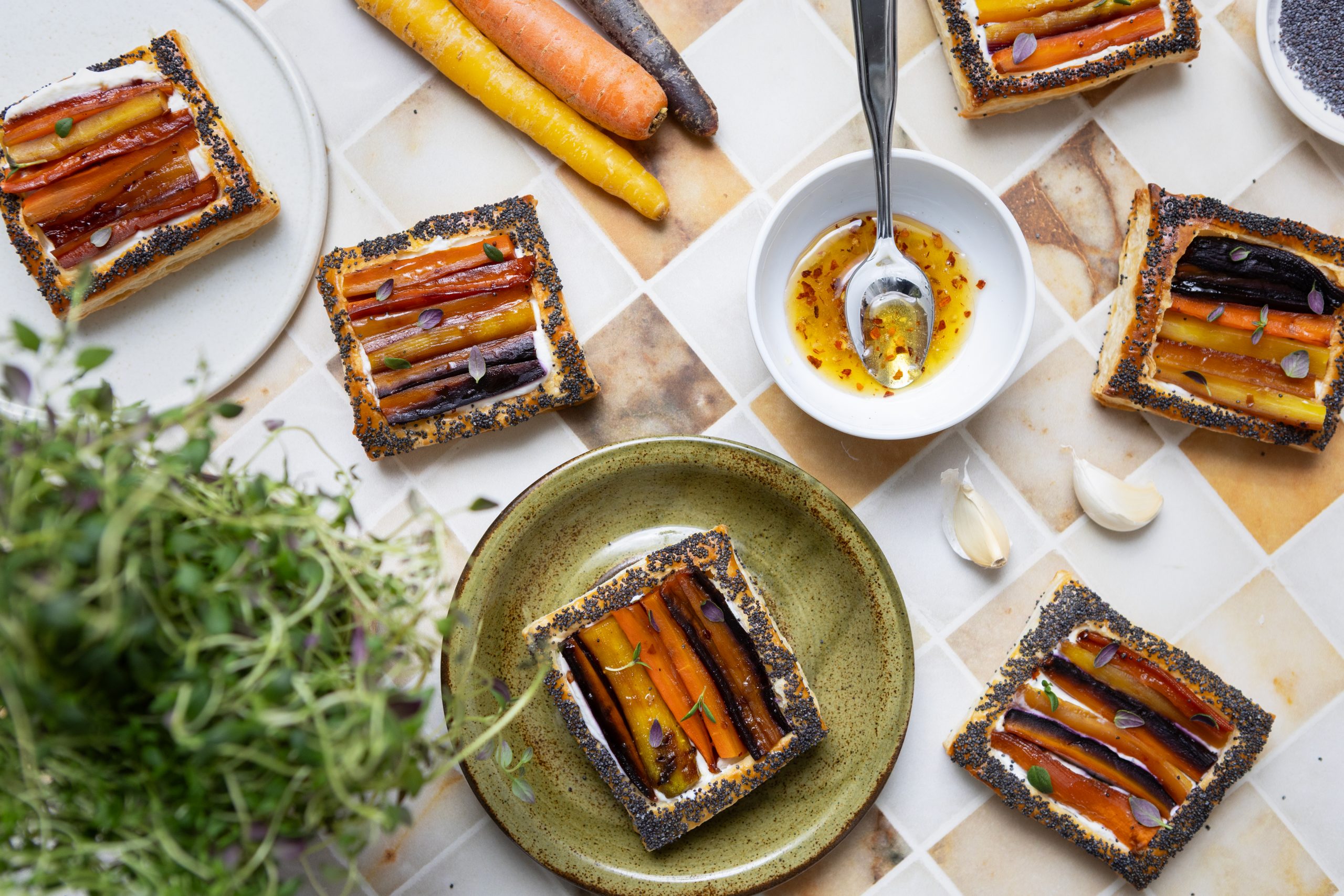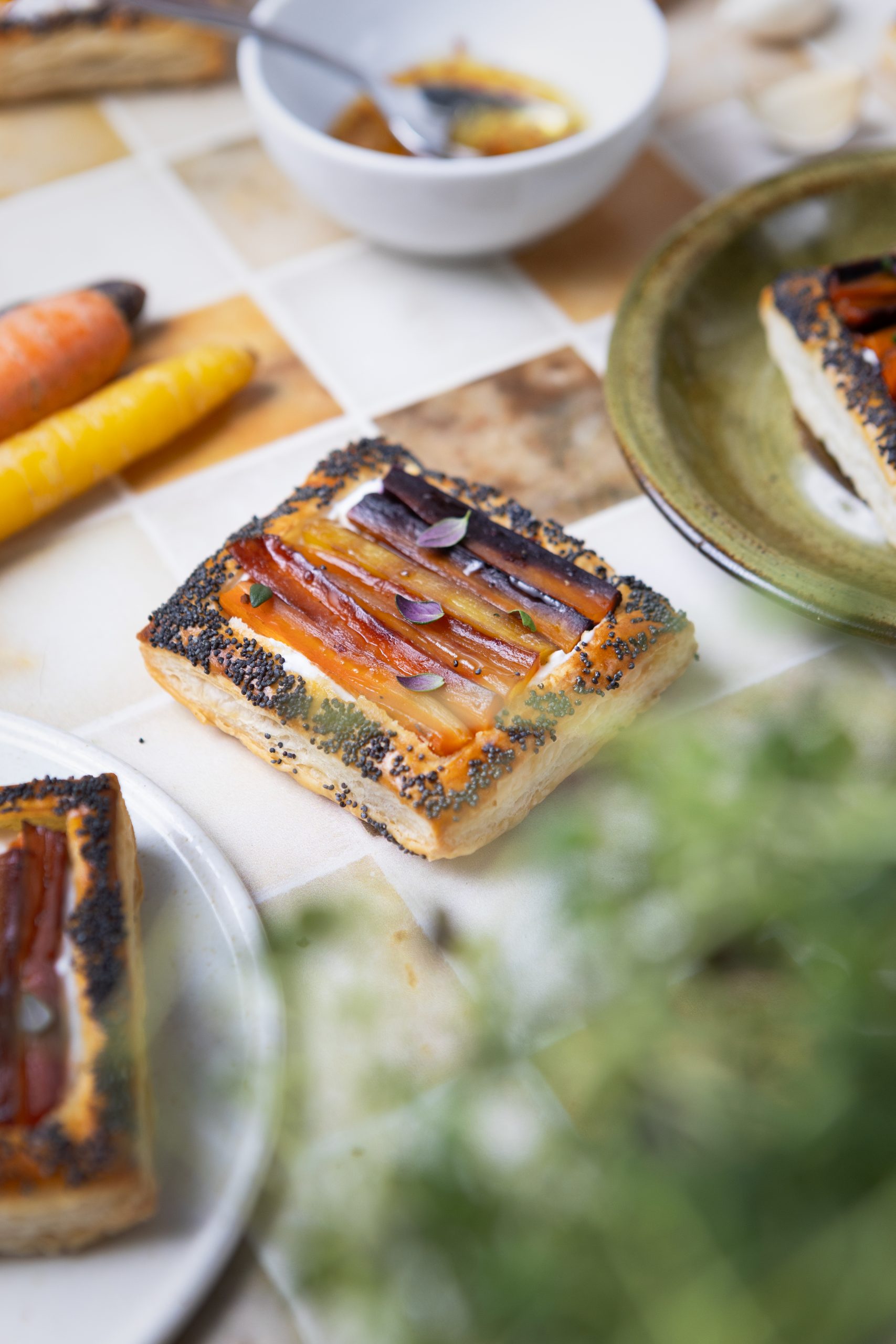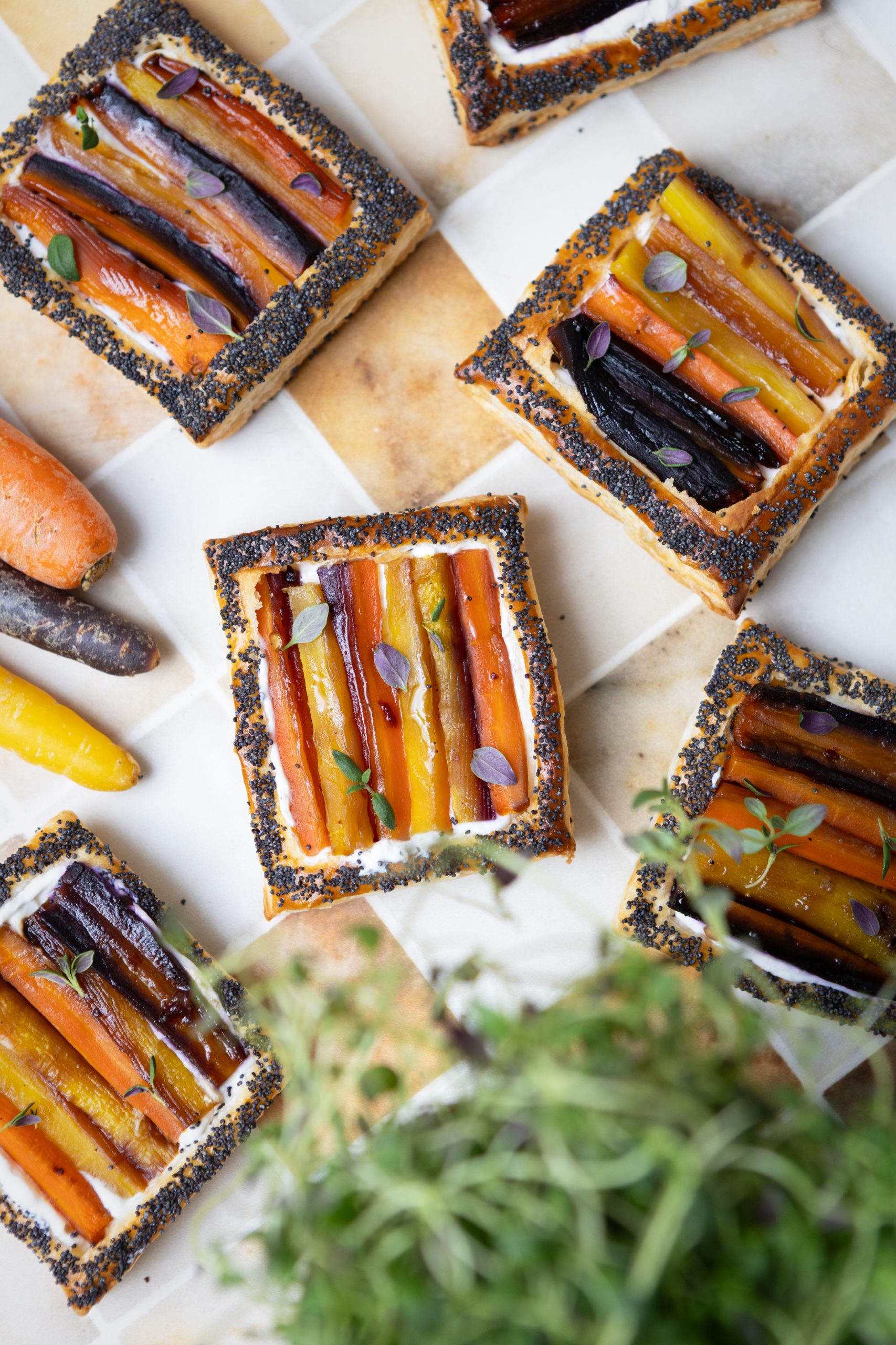 Rapeat lehtitaikinatartaletit saavat täytteekseen sitruunalla ja timjamilla maustetun ricottatäytteen sekä hot honey -paahdetut porkkanat. Pikku tartaletit sopivat ihanasti viikonlopun brunssipöytään tai pidemmän illallismenun alkupalaksi.