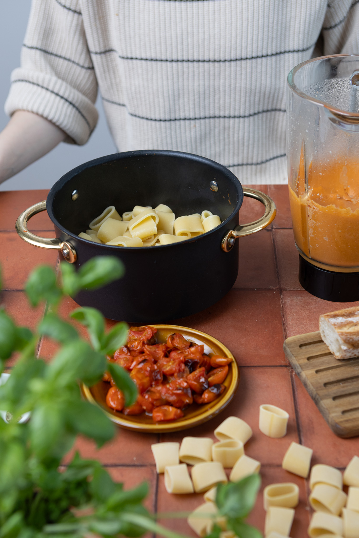Sekoita pasta kastikkeeseen ja viimeistele halutessassi mozzarellalla, paahdetuilla kirsikkatomaateilla, parmesaanilla ja basilikalla. Buon appetito!